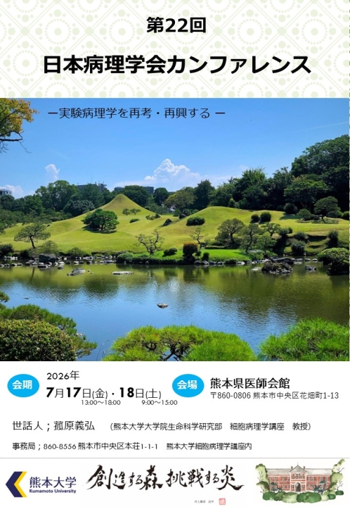 | 開催場所 :熊本県医師会館 (熊本県熊本市中央区花畑町1−13) 開催期間 :2026年7月17日(金)~ 18日(土) 開催形式 :基本的には対面形式 (※交通事情などによりオンライン併用の可能性あり) 問い合わせ:kumapath02@gmail.com 演題募集・参加登録・プログラム:3月以降に掲載 |