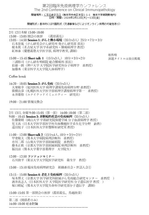 | 開催場所 :くすのきテラス (熊本市中央区本荘1-1-1 熊本大学病院敷地内) 開催期間 :2026年2月12日(木)~ 13日(金) 開催形式 :基本的には対面形式 (※交通事情などによりオンライン併用の可能性あり) 問い合わせ:2ndconferenceimmunopathol@gmail.com |