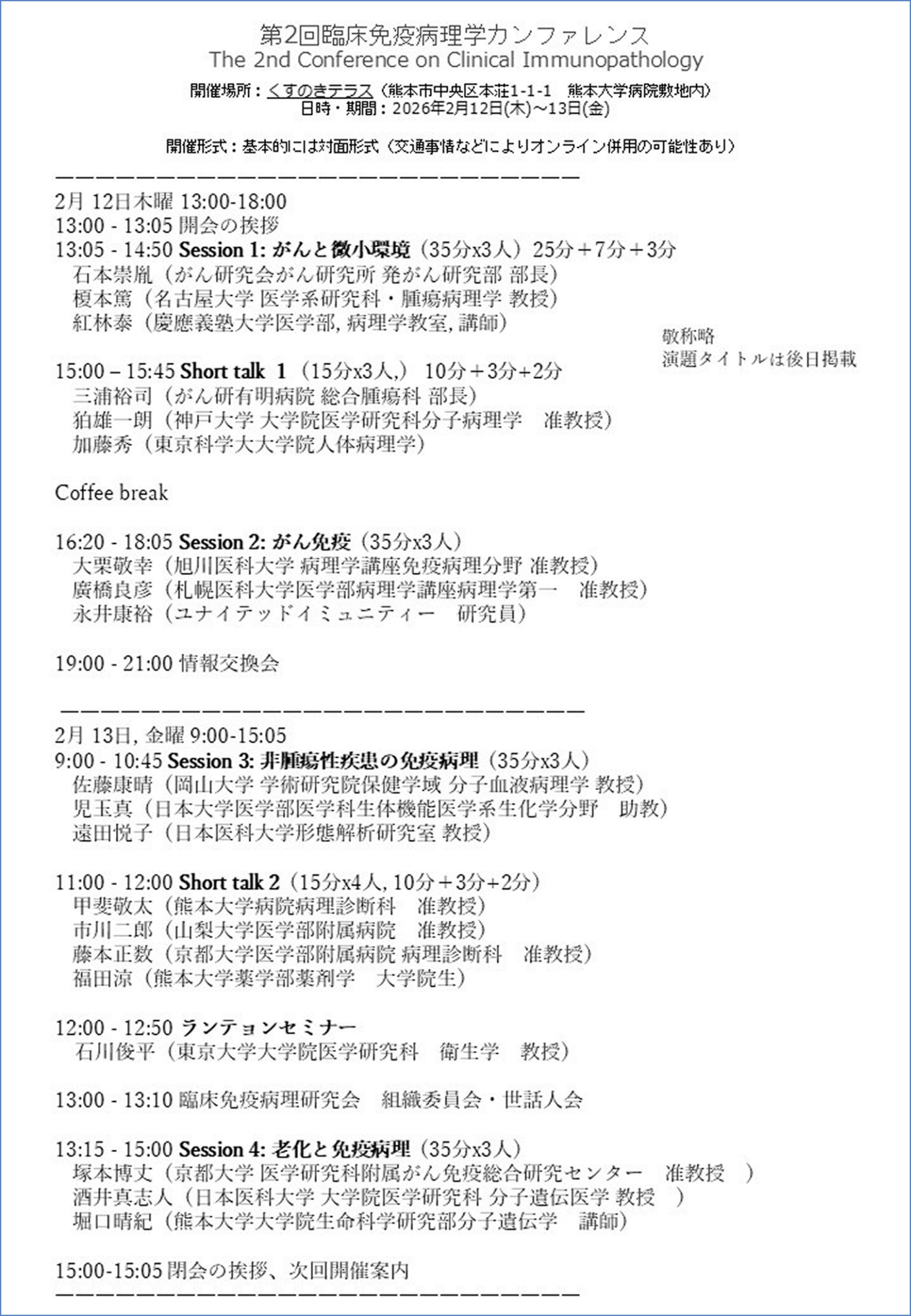 | 2月13日(金) 9:00~15:05 9:00 - 10:45 Session 3:非腫瘍性疾患の免疫病理 (35分×3人) 11:00 - 12:00 Short talk 2(15分×4人) 12:00 - 12:50 ランチョンセミナー 13:00 - 13:10 臨床免疫病理研究会 組織委員会・世話人会 13:15 - 15:00 Session 4:老化と免疫病理(35分×3人) |